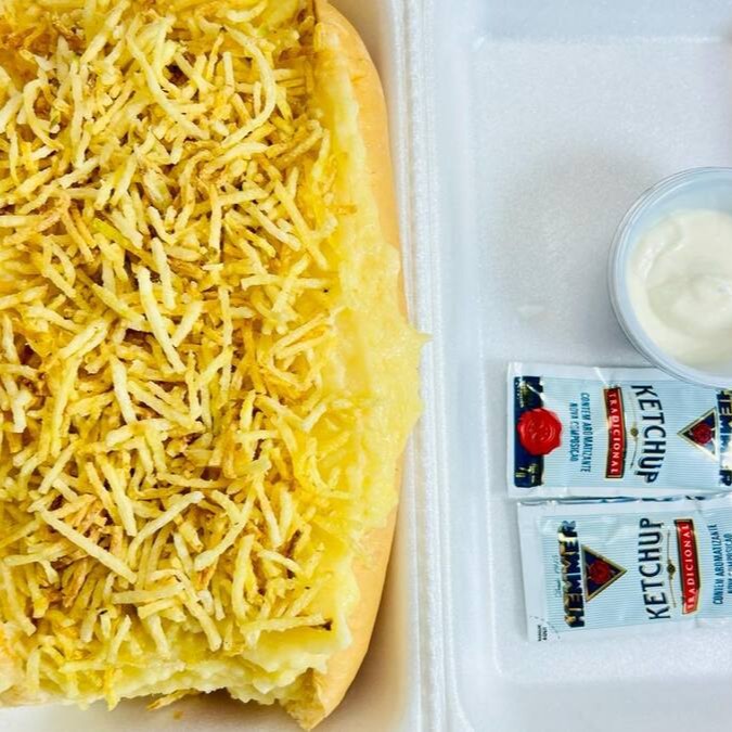 Delicioso Hot Dog, 2 salsichas Sadia, purê de batatas caseiro, vinagrete, catchup, requeijão, maionese grill, milho, ervilha e batata palha uma delícia é um hot dog generoso no sabor e no tamanho!