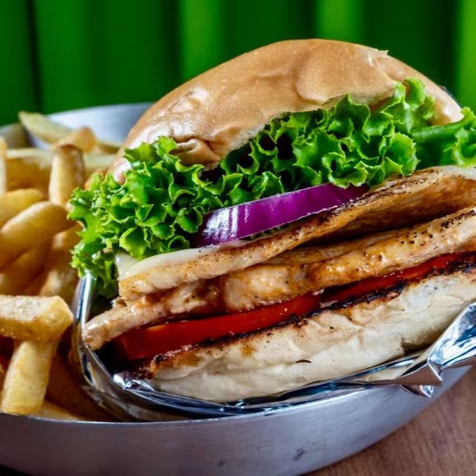Pão, Filé de Frango Grelhado, queijo, alface, tomate, cebola roxa, maionese grill e molho da casa. Acompanha fritas e Coca-Cola 220ml ou zero