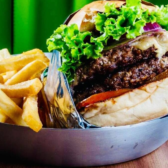 Monster: 2 hambúrgueres 160g de fraldinha, pão de burguer, queijo, alface, tomate, cebola roxa, maionese grill e molho da casa. Acompanha fritas e Coca-Cola 220ml