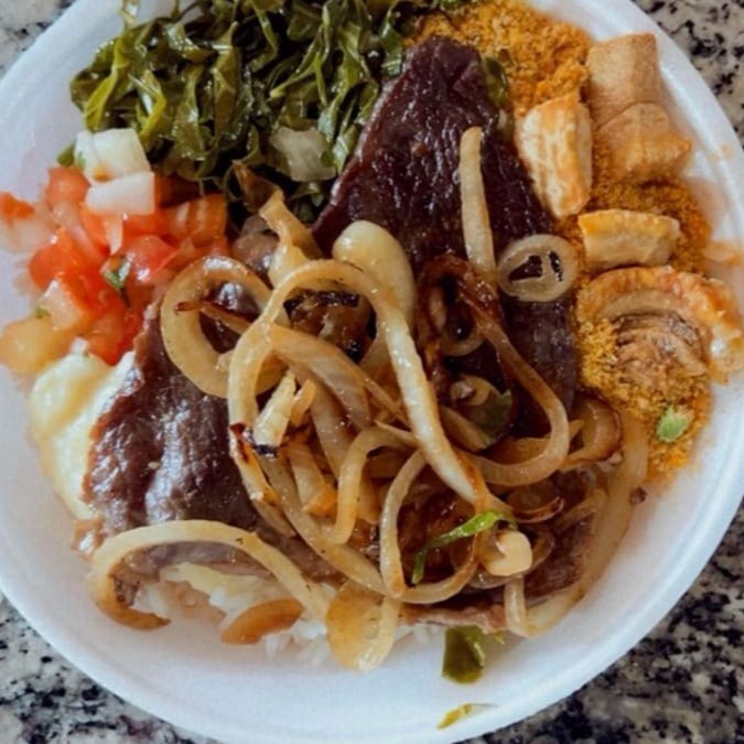 Arroz, Feijão, quiabo refogado , Vinagrete, Farofa e salada