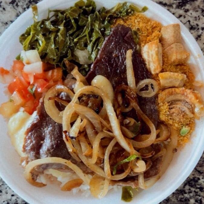 Arroz, Feijão,Couve ,Torresmo Vinagrete, Farofa e salada