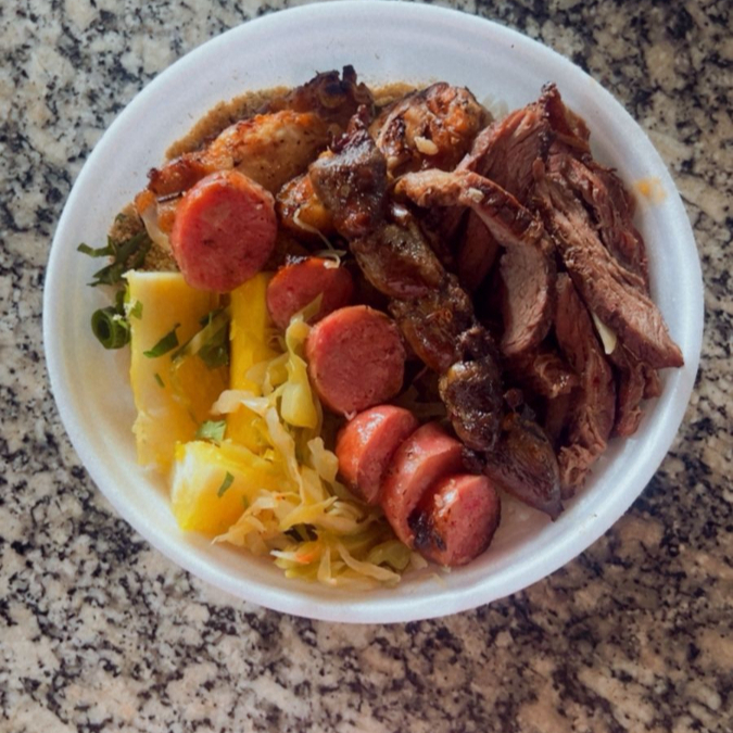 Arroz, Feijão, Couve ,Torresmo Vinagrete, Farofa e salada