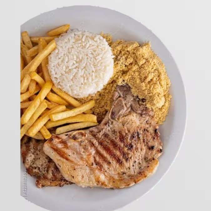 Arroz, tutu de feijão, bisteca suína, Torresmo, banana, ovo, farofa e Linguiça.