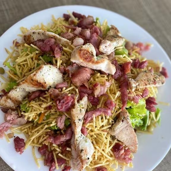 Alface, Ervilha, milho, palmito, bacon, batata palha, frango 150g
