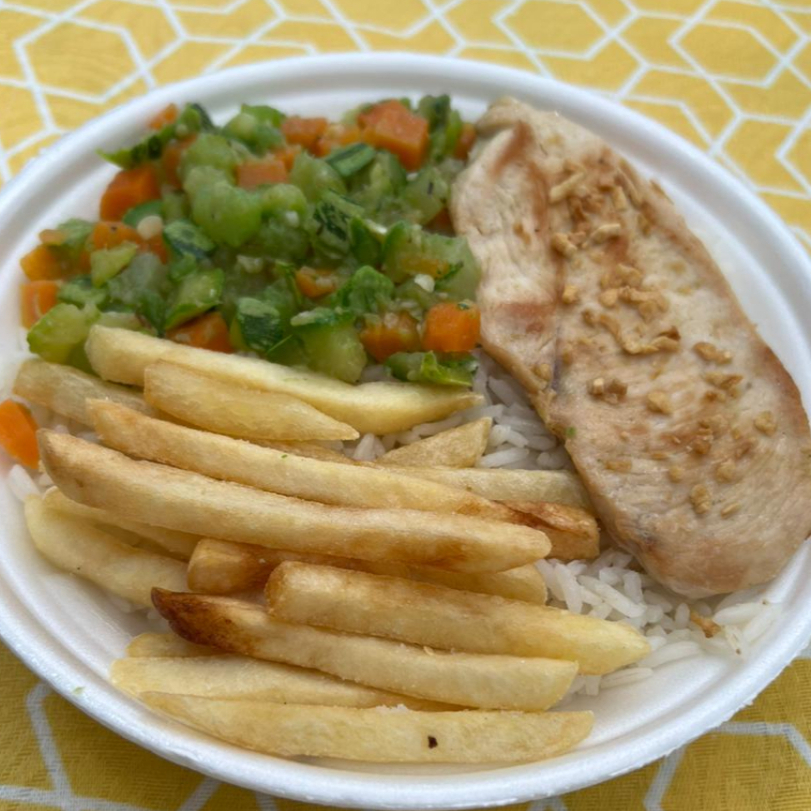 Filé de Frango Grelhado marinado em temperos naturais e grelhado até ficar dourado por fora e suculento por dentro.