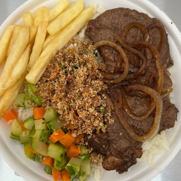 Corte nobre de carne bovina, grelhado na chapa em alta temperatura para selar a suculência e garantir o sabor marcante da carne.
