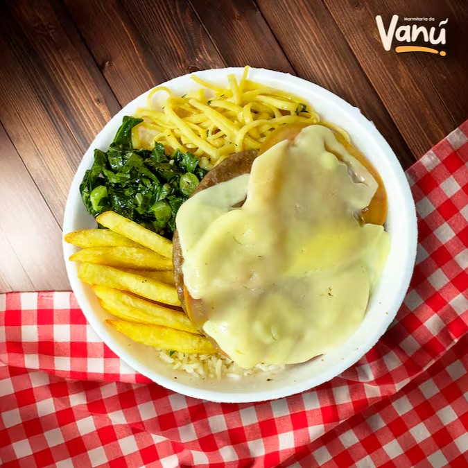 Hambúrguer sabor Picanha 120gramas com Tomate e Queijo, Arroz, Feijão, Macarrão e mais 2 do Dia!