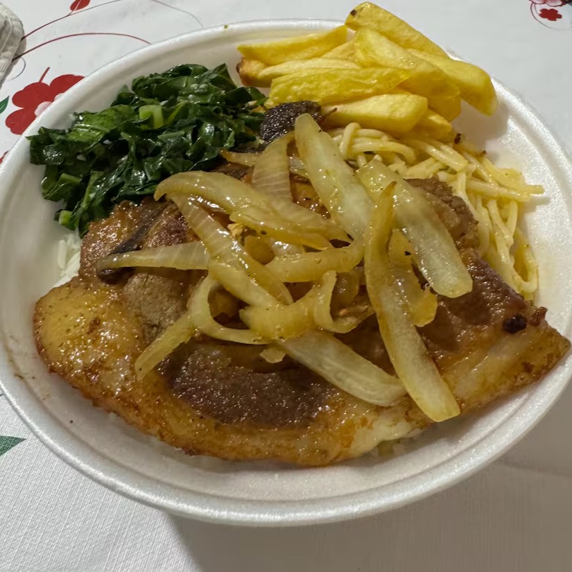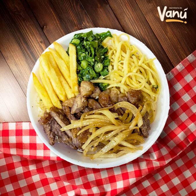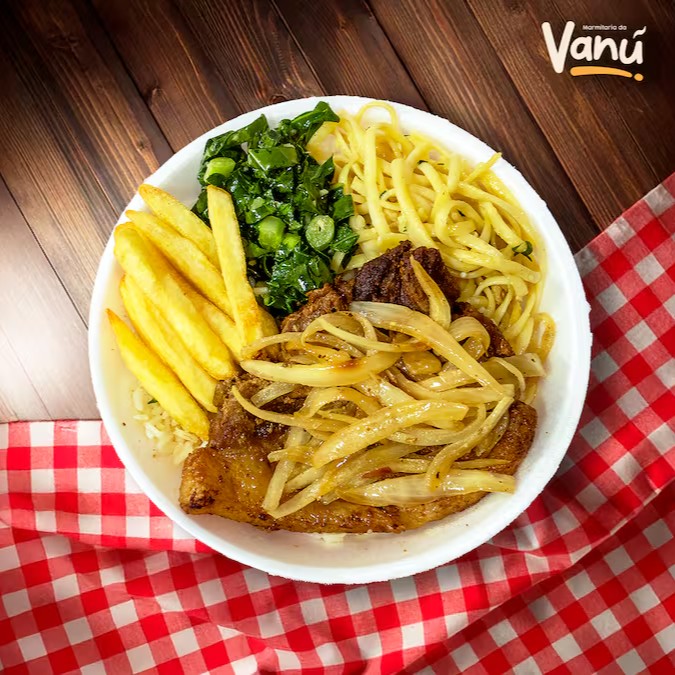 Contrafilé em Tiras Acebolado com Arroz, Feijão, macarrao e mais 2 do Dia!