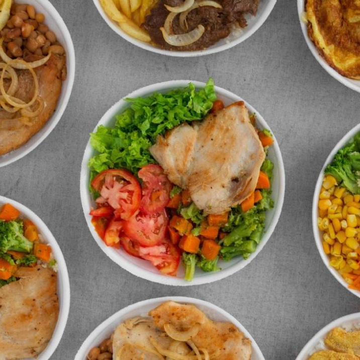 Arroz, Feijão, Refogado, Farofa, Macarrão ou Batata Frita + 3 Misturas