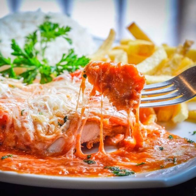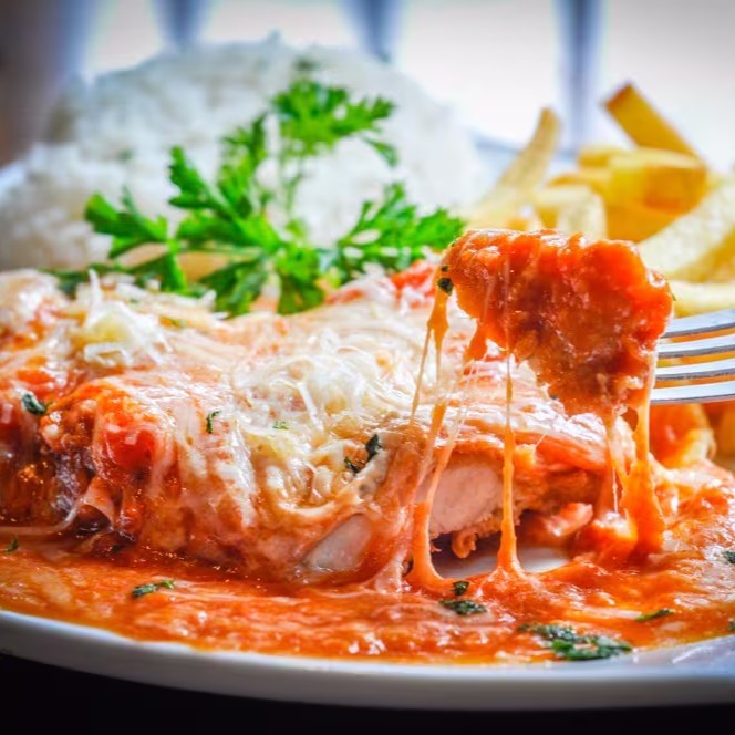 Deliciosa marmita de Parmegiana De Frango, coberto com um molho delicioso e aquele queijo de qualidade que só vc merece,,, Acompanha Arroz / Feijão / Farofa / Fritas