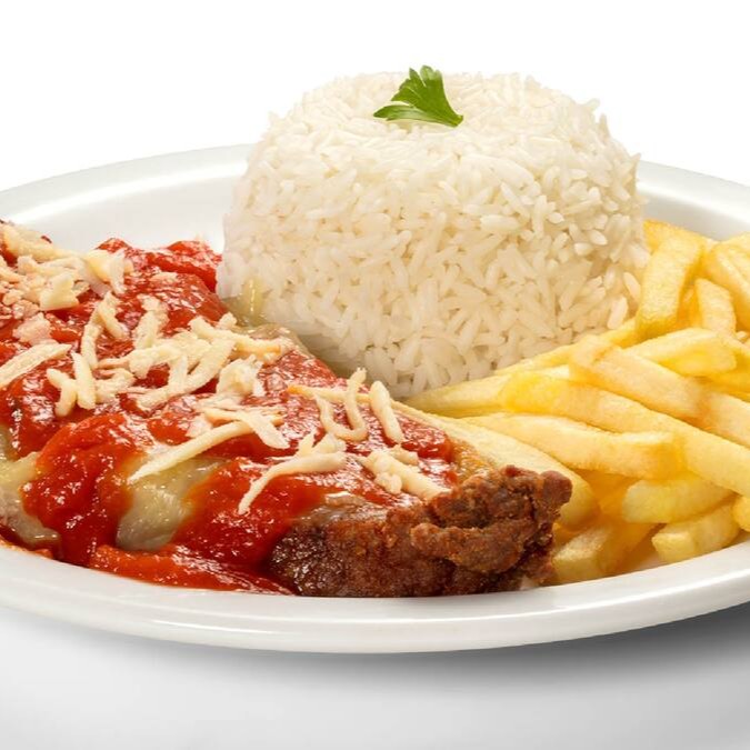 Delicioso Filé De Frango Empanado Em Farinha Especial Coberto Com Mussarela E Um Molho Vermelho Delicioso, Acompanha Arroz, Batata Frita Mais Um Acompanhamento A Sua Escolha. ( Não Acompanha Feijão ) É Servida Em Uma Marmita Retangular Com Divisória De 1200 Ml.