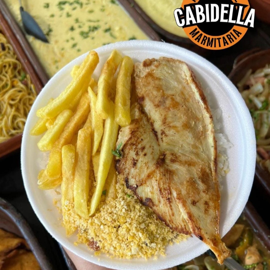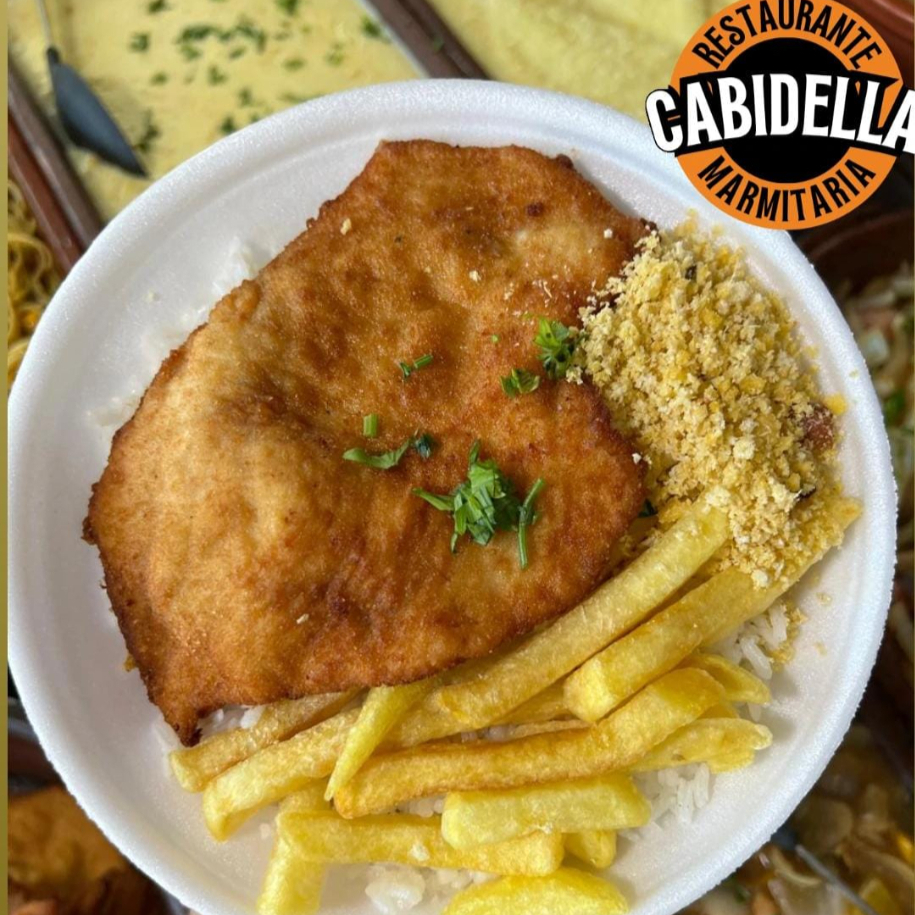 Marmitex file empanado, arroz, feijão e dois acompanhamentos de sua preferência.
