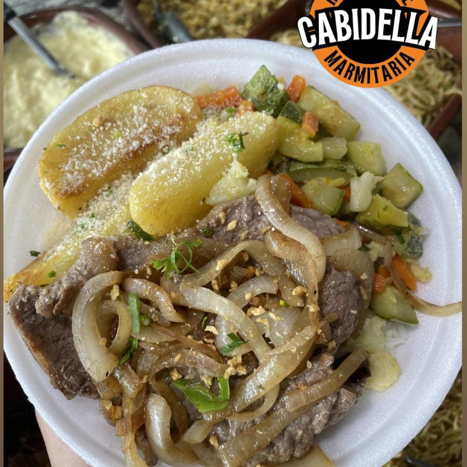 Marmitex contra filé acebolado, arroz, feijão e dois acompanhamentos de sua preferência.