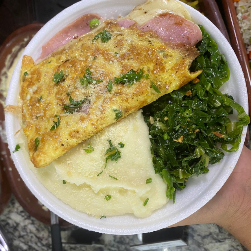 Marmitex omelete recheado, arroz, feijão e dois acompanhamentos de sua preferência