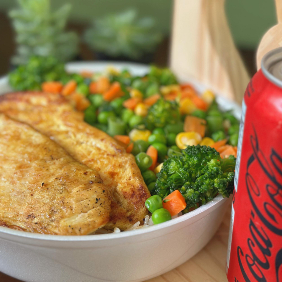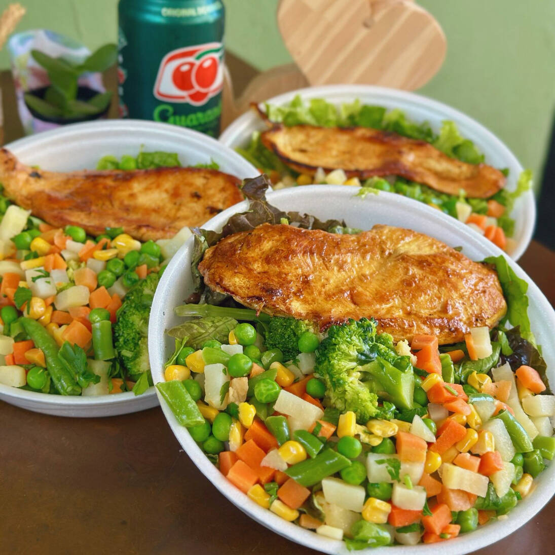 Salada de folhas frescas (alface e rúcula), delicioso filé de frango grelhado com especiarias da casa e legumes ao vapor na manteiga. Acompanha sachê de molho para temperar a salada.