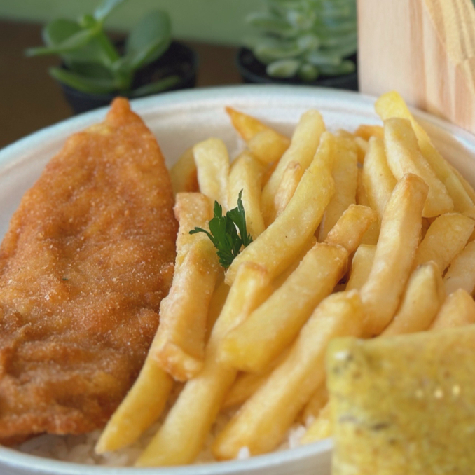 Delicioso frango empanado e frito, acompanhado de arroz branco soltinho, batata frita crocante e farofa à base de açafrão com cebolas caramelizadas.