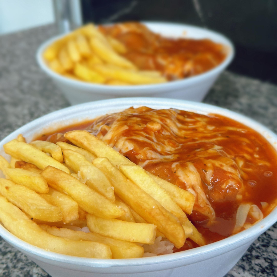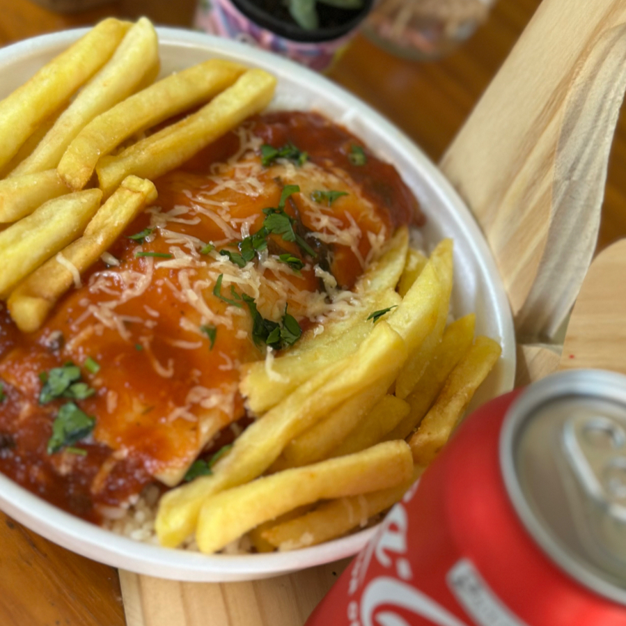 Delicioso frango empanado, coberto com nosso molho caseiro de tomate, acompanhado de arroz branco soltinho e batata frita crocante.
