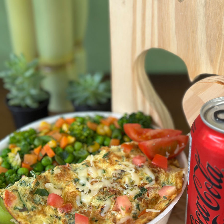 Delicioso omelete preparado com nossas especiarias da casa, tomate e queijo, servido com arroz branco soltinho, feijão à moda do Ervas Finas e legumes ao vapor na manteiga.