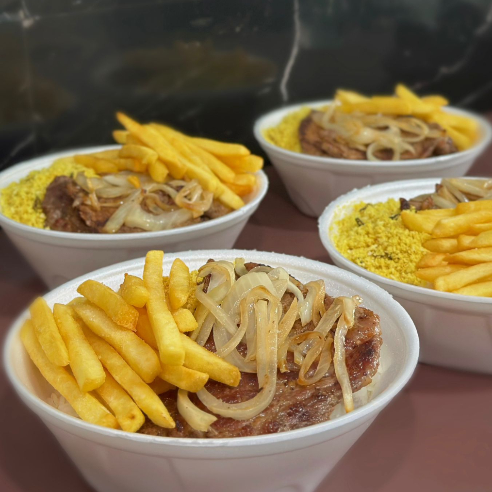 Delicioso contrafilé grelhado (120g), acompanhado de arroz branco soltinho, feijão à moda do Ervas Finas, batata frita crocante e nossa farofa temperada à base de açafrão e cebola caramelizada.