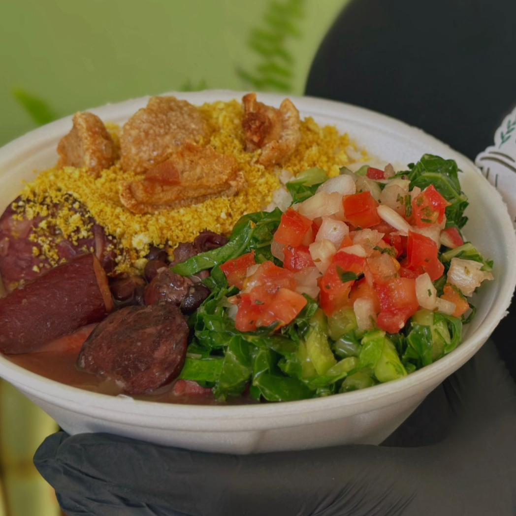 Deliciosa feijoada preparada com carnes leves e selecionadas. Acompanha arroz branco soltinho, torresmo crocante, farofa da casa, couve refogada ao alho e vinagrete fresquinho.