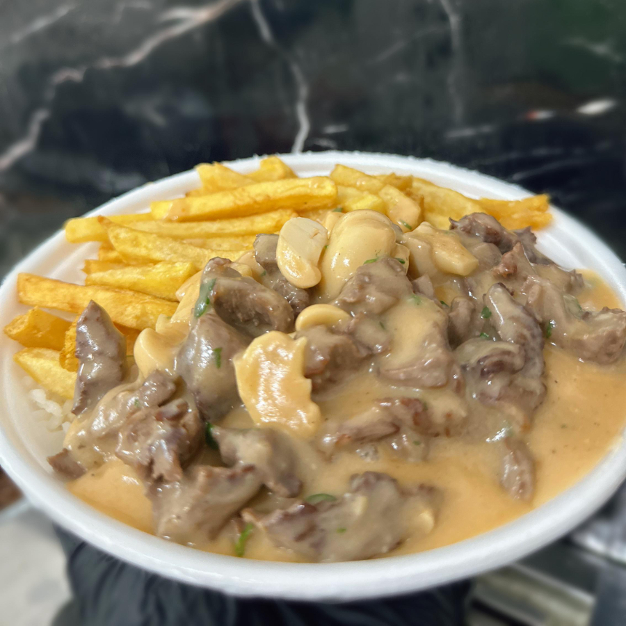 Strogonoff de filé mignon (100g) coberto com molho branco artesanal e champignons, acompanhado de arroz branco soltinho e batata palha.