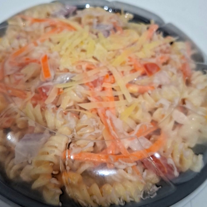 Macarrão parafuso, cenoura ralada, milho, tomate, cebola, azeitonas, queijo parmesão fresco, frango desfiado. Temperado com maionese hellmans, limão e azeite. Acompanha uma mistura de sua preferência.