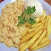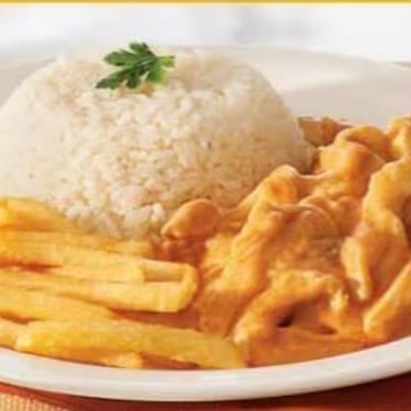 Cremoso e saboroso strogonoff de frango, servido com arroz soltinho e batata frita crocante.
