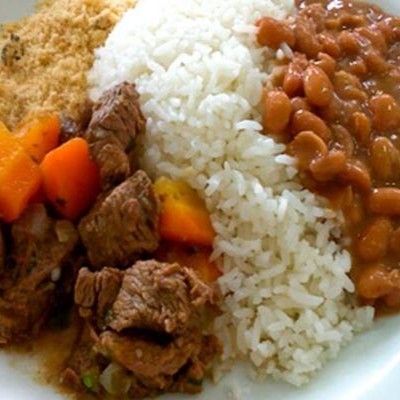 Carne de panela macia e saborosa com mandioca cozida. Acompanha arroz branco soltinho, feijão temperado no alho, macarrão ao alho e óleo e farofa crocante na manteiga.