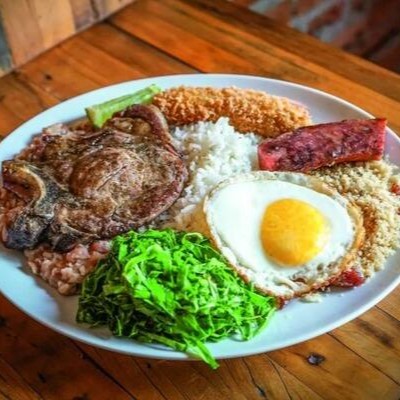 Um clássico da culinária brasileira! Bisteca suculenta acompanhada de couve refogada, linguiça, ovo frito, arroz branco soltinho e tutu de feijão temperado no alho.