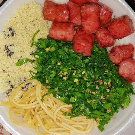 Linguiça toscana grelhada, couve refogada, arroz soltinho, feijão temperado, macarrão ao alho e óleo e farofa crocante na manteiga.
