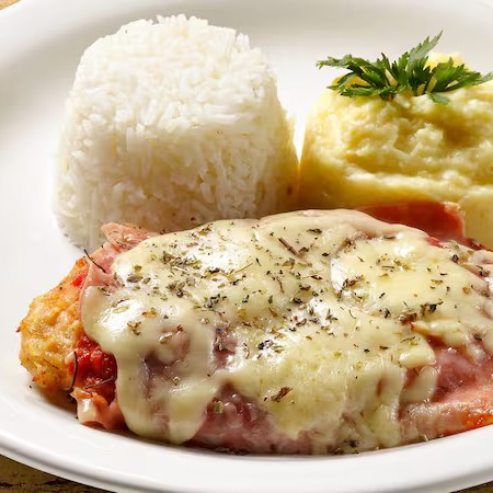 Saboroso bife à parmegiana suculento, purê de batata cremoso, arroz soltinho, feijão temperado, macarrão ao alho e óleo e farofa na manteiga.