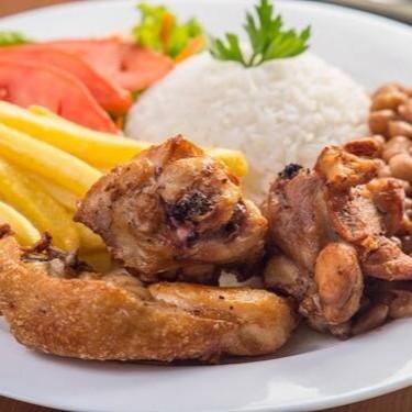 Frango a passarinho crocante com batata frita dourada. Acompanha arroz branco soltinho, feijão temperado no alho, macarrão ao alho e óleo e farofa crocante na manteiga.
