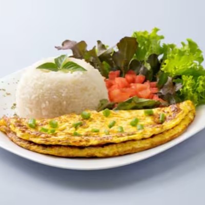 Omelete caseira leve e saborosa, servida com salada fresca. Acompanha arroz branco soltinho, feijão temperado no alho, macarrão ao alho e óleo e farofa crocante na manteiga.