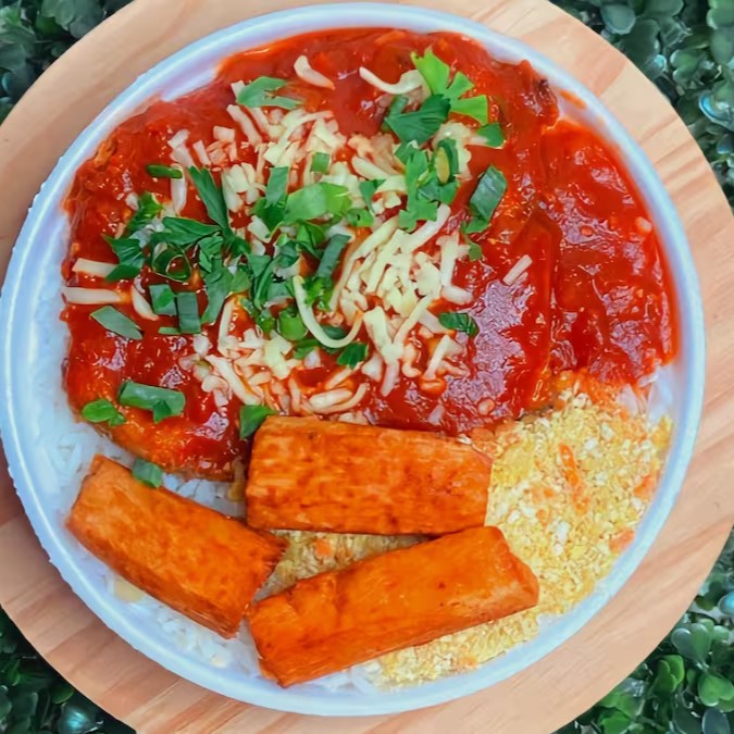 Deliciosa Abobrinha à parmegiana, acompanha arroz, feijão e acompanhamentos a sua escolha.