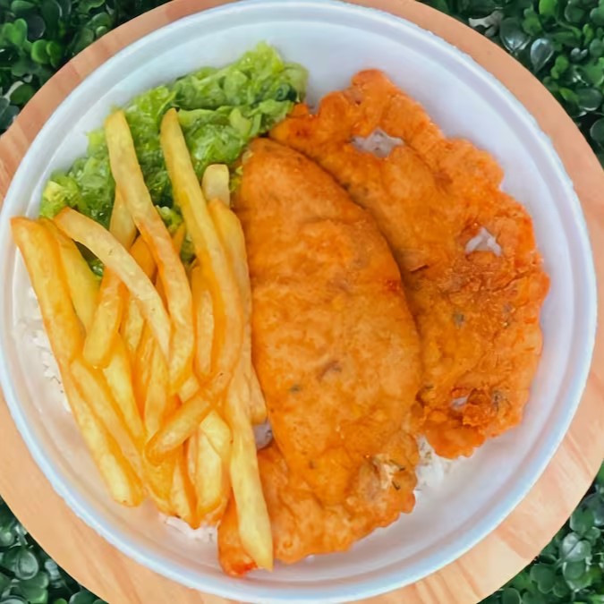 Delicioso Filé de frango à milanesa, acompanha arroz, feijão e acompanhamento a sua escolha.