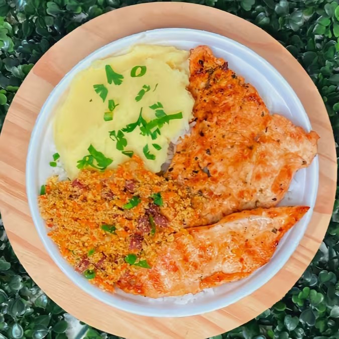 Delicioso filé de frango grelhado, acompanha arroz, feijão e acompanhamentos a sua escolha.