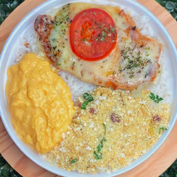 Delicioso filé de frango grelhado coberto com queijo, tomate e orégano, acompanha arroz, feijão e acompanhamentos a sua escolha.