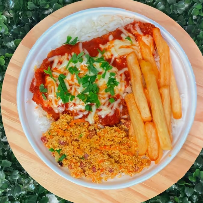 Filé de frango à parmegiana coberto com molho de tomate e queijo derretido, acompanhado de arroz soltinho, feijão temperado e batata frita crocante. Uma refeição completa e deliciosa para qualquer momento.