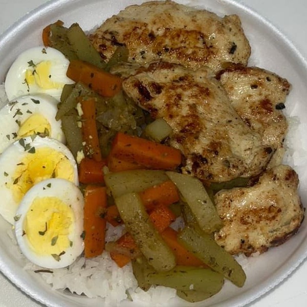 Acompanha: Arroz, Feijão, Refogado do Dia, Filé de Frango grelhado e Ovo cozido.