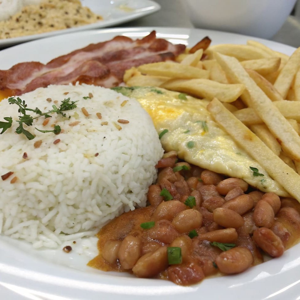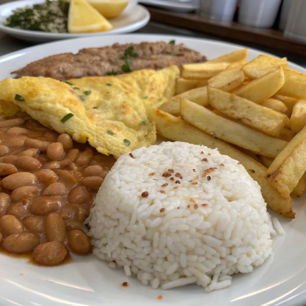 Omelete fofinho recheado com queijo derretido e bacon crocante, servido com arroz soltinho, feijão temperado, farofa dourada e batata frita sequinha e salada de beterraba