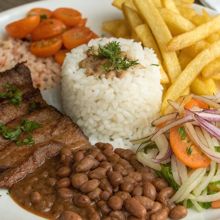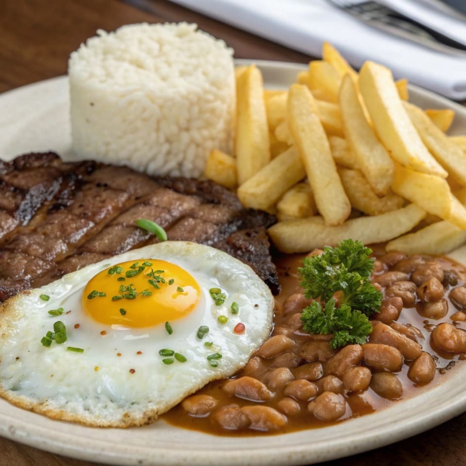 Suculento bife grelhado, coberto com ovo frito no ponto perfeito, acompanhado de arroz soltinho, feijão temperado, farofa crocante, salada de beterraba e batata frita dourada.
