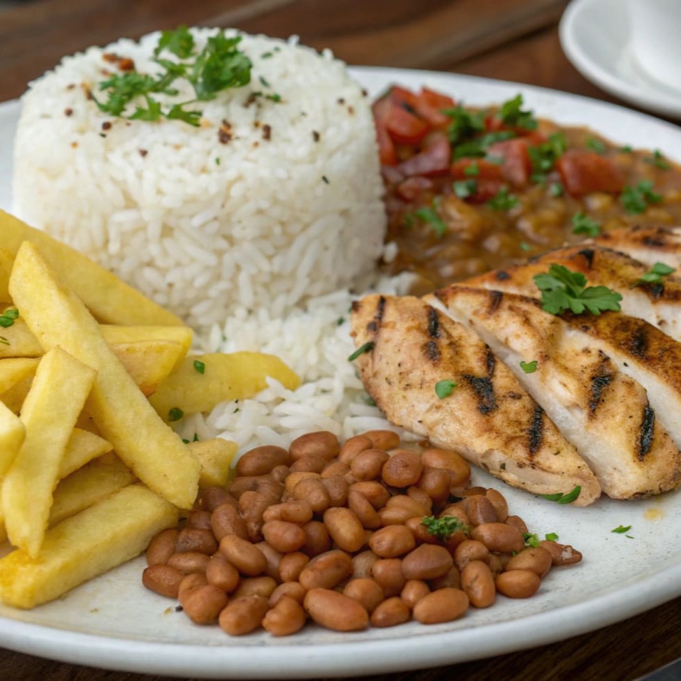 Filé de frango grelhado no ponto certo, acompanhado de arroz soltinho, feijão fresquinho, farofa crocante e batata frita dourada salada de cenoura