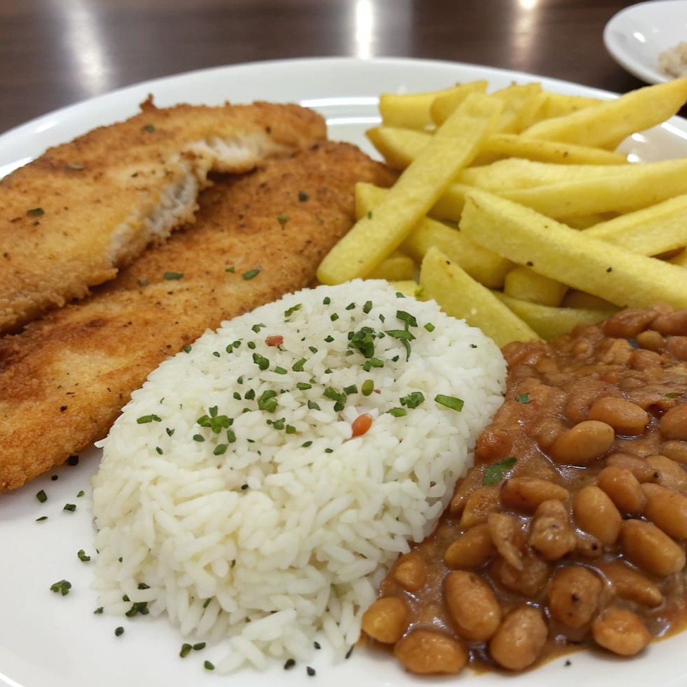 Filé de tilápia empanado e frito até atingir crocância perfeita, servido com arroz soltinho, feijão temperado, farofa dourada, batata frita crocante e salada de beterraba.