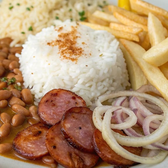 Calabresa fatiada e dourada com cebolas, servida com arroz soltinho, feijão temperado, farofa crocante. Fresquinha e batata frita bem sequinha ,salada de cenoura com repolho