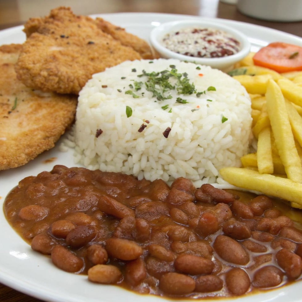 Filé de frango suculento empanado e frito até ficar dourado e crocante, servido com arroz soltinho, feijão temperado, farofa crocante, batata frita sequinha e salada fresca de beterraba.