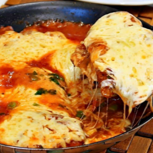 Deliciosa marmita de frango à parmegiana: filé de frango empanado, coberto com molho de tomate e queijo. Uma refeição completa, saborosa e caseira! Acompanha arroz, feijão e guarnições do dia.