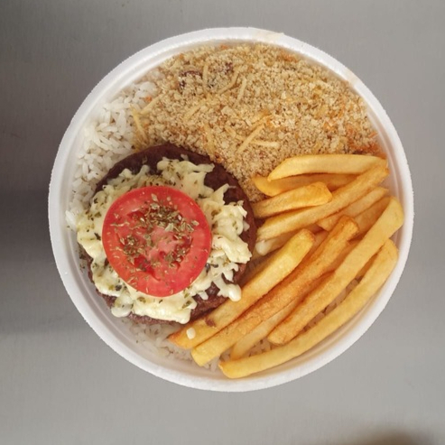 Arroz,feijão deliciosa proteína vegetal a pizzaiolo e fritas