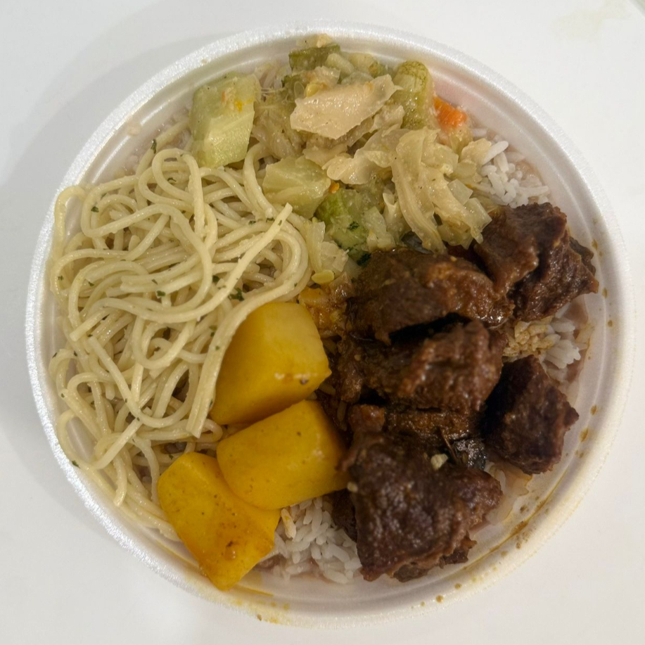 Carne de panela macia com batata, acompanhada de arroz, feijão e guarnição à sua escolha