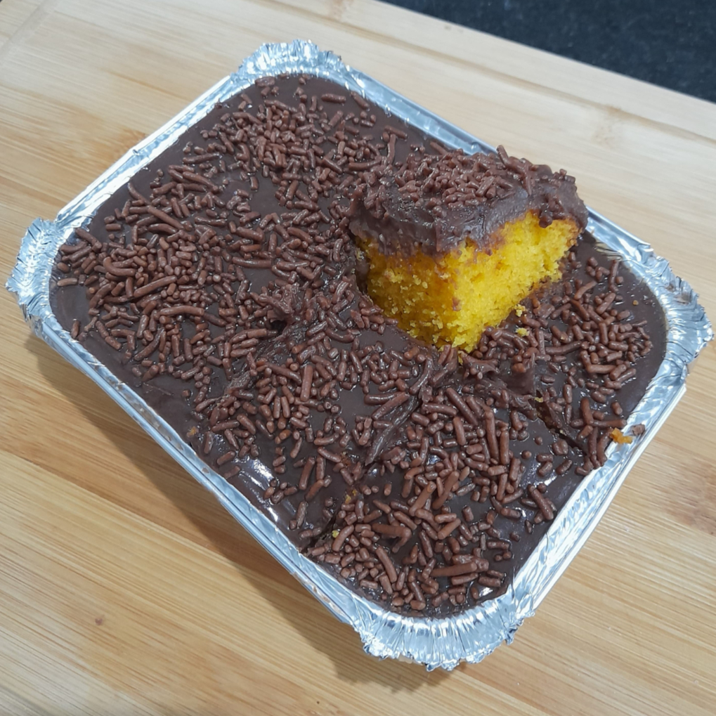 Bolo fofinho de cenoura, feito com receita caseira e carinho, coberto com uma generosa camada de brigadeiro cremoso e brilhante. Cada colherada é uma explosão de sabor que abraça sua vontade de doce, na medida certa para matar a sua fome com conforto e praticidade. Ideal para sua tarde, café ou presentear quem você ama.