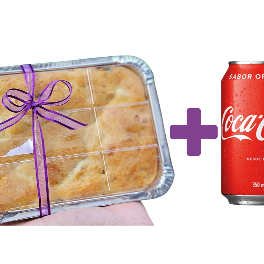 Coca-Cola 350ml + Marmita 500ml de Torta recheada com frango desfiado, milho e requeijão cremoso, feito com tempero caseiro e massa levinha, perfeita para qualquer hora do dia.